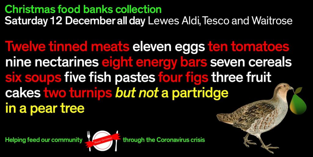 Saturday 12 December, Lewes Labour will be collecting for the Lewes food banks as part of a town-wide coalition of clubs, societies and political parties. We’ve really enjoyed feeding our community throughout the Coronavirus, and this month our collection goes aural.
